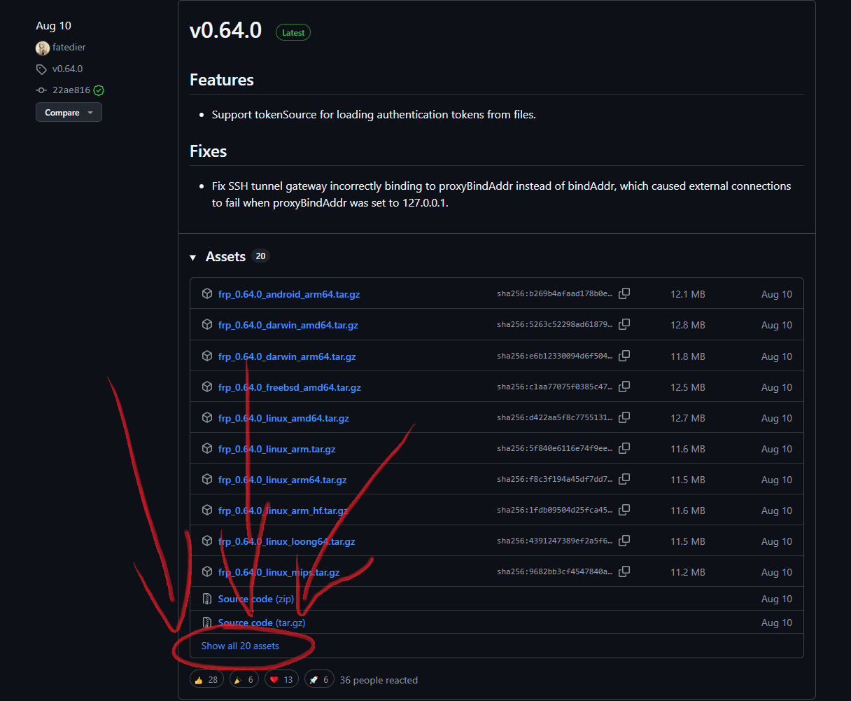 在展开的列表里,应该可以找到「frp_x.xx.x_windows_amd64.zip」的zip压缩文件,点击下载即可。